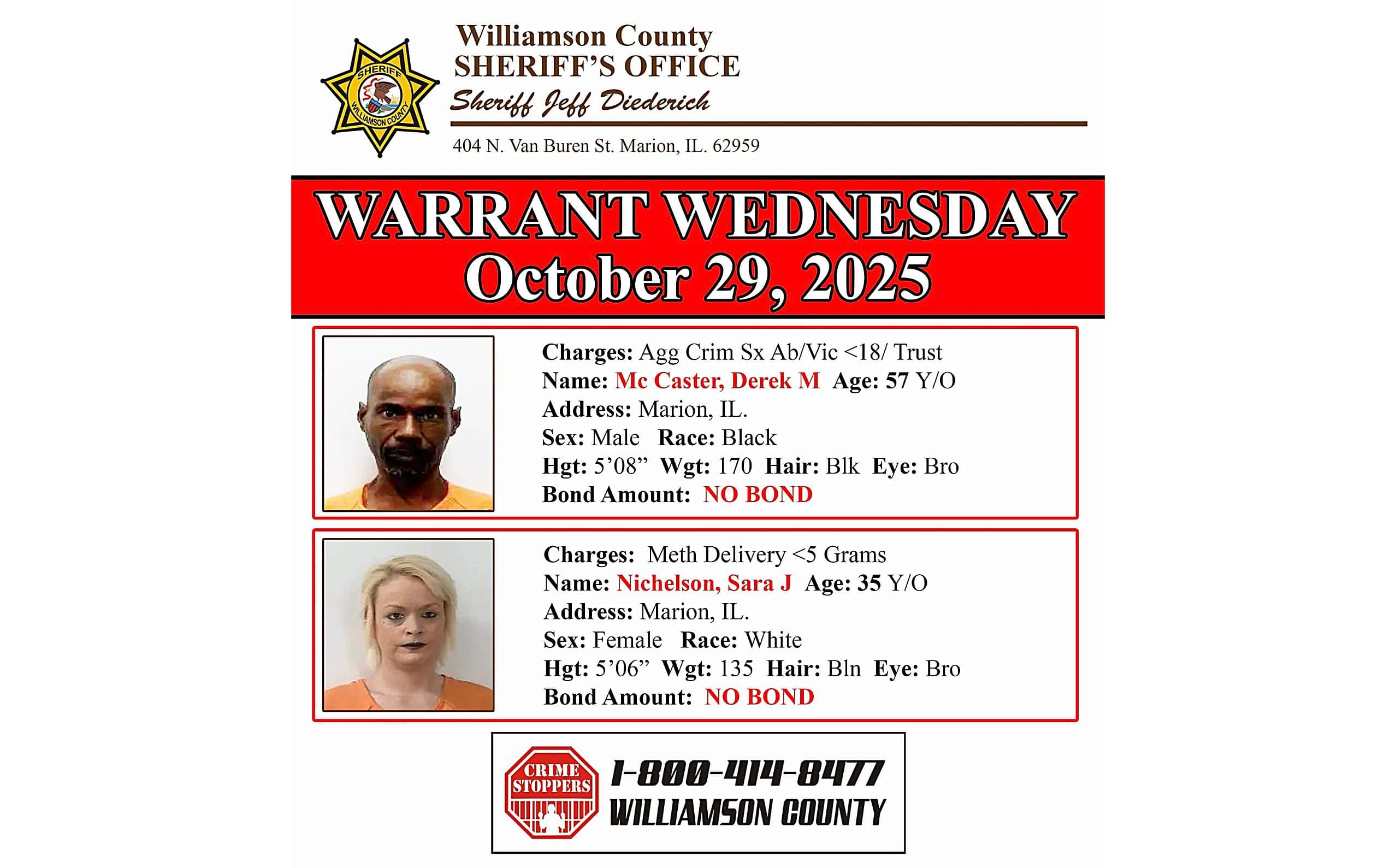 MARION – Williamson County Sheriff Jeff Diederich is looking for these two individuals shown below who are wanted for various crimes.